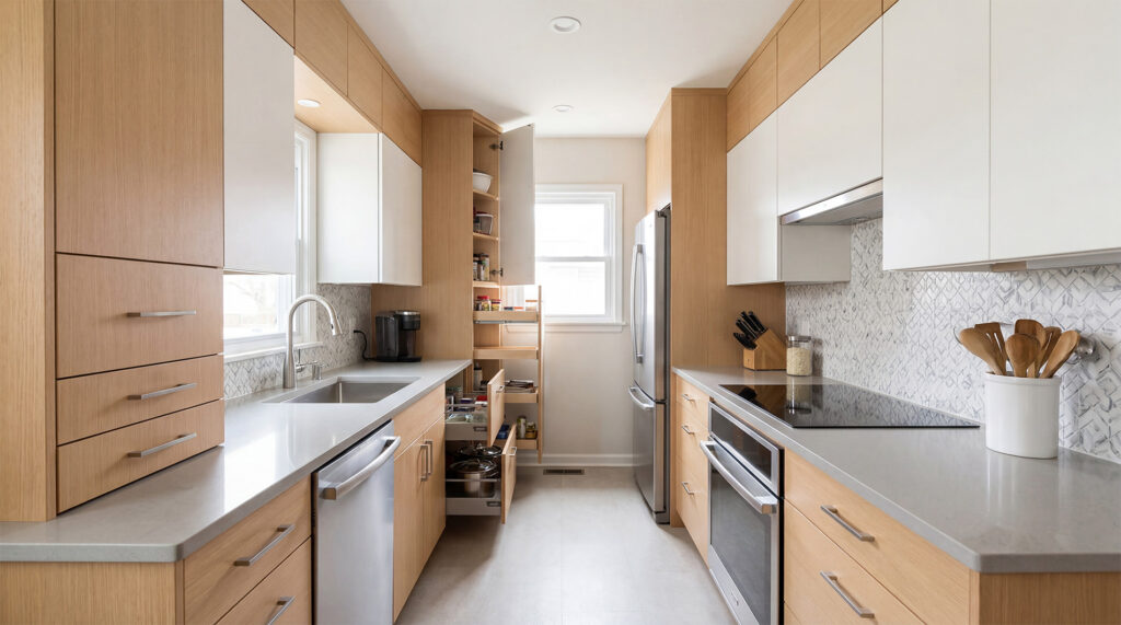 Buyers in Schiller Park need highly functional layouts that make cooking, cleaning, and entertaining much easier. Together, we find the absolute right spot for your sink, stove, and refrigerator to create an efficient daily workflow. Narrow kitchens, particularly those found in the East O’Hare neighborhood, need smart storage solutions to feel open and inviting. Our design process guarantees your new layout fits your specific footprint perfectly.